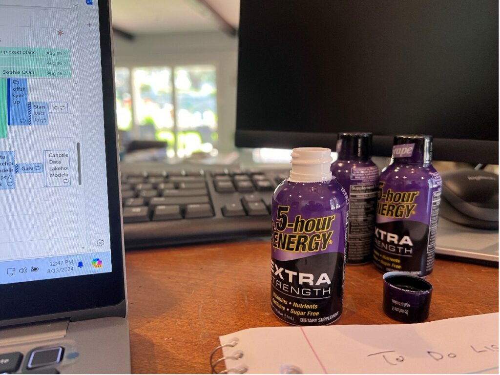I live in the Central time zone, so I start my workday around 8:00 AM to accommodate clients living on the East Coast. To kickstart my energy, I’ll open a 5-Hour Energy bottle, drinking half of it to boost my productivity. I’ll reserve the rest for a mid-morning pick-me-up; nothing like a strong dose of B-12 to keep you going! I’ll log in to my computer, check my calendar, and catch up on emails to assess any high priority needs or urgent issues.
