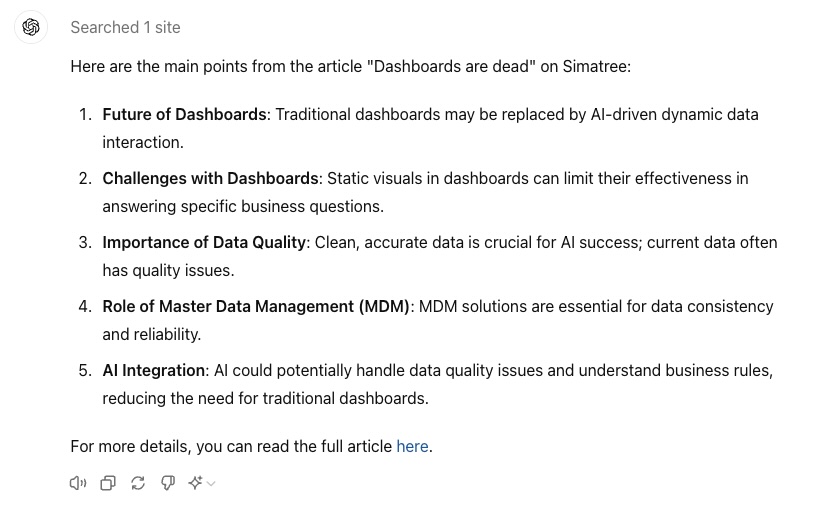Prompt: “Summarize the content of this webpage into 5 bullets: https://simatree1.com/insights/articles/dashboards-are-dead/”