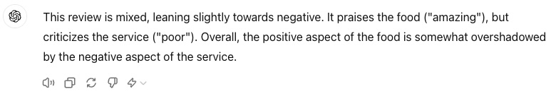 Prompt: “Determine if this review is positive or negative: ‘The food was amazing but the service was poor.'”