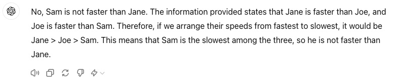 Prompt: “Jane is faster than Joe. Joe is faster than Sam. Is Sam faster than Jane? Explain.”
